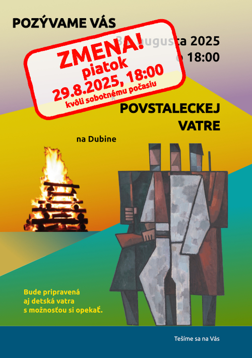 Zapálenie povstaleckej vatry kvôli sobotnej nepriaznivej predpovedi počasia presúvame na piatok 29.8.2025. Verím, že to veľmi nenaruší Vaše plány a vatru si užijeme v suchu.
